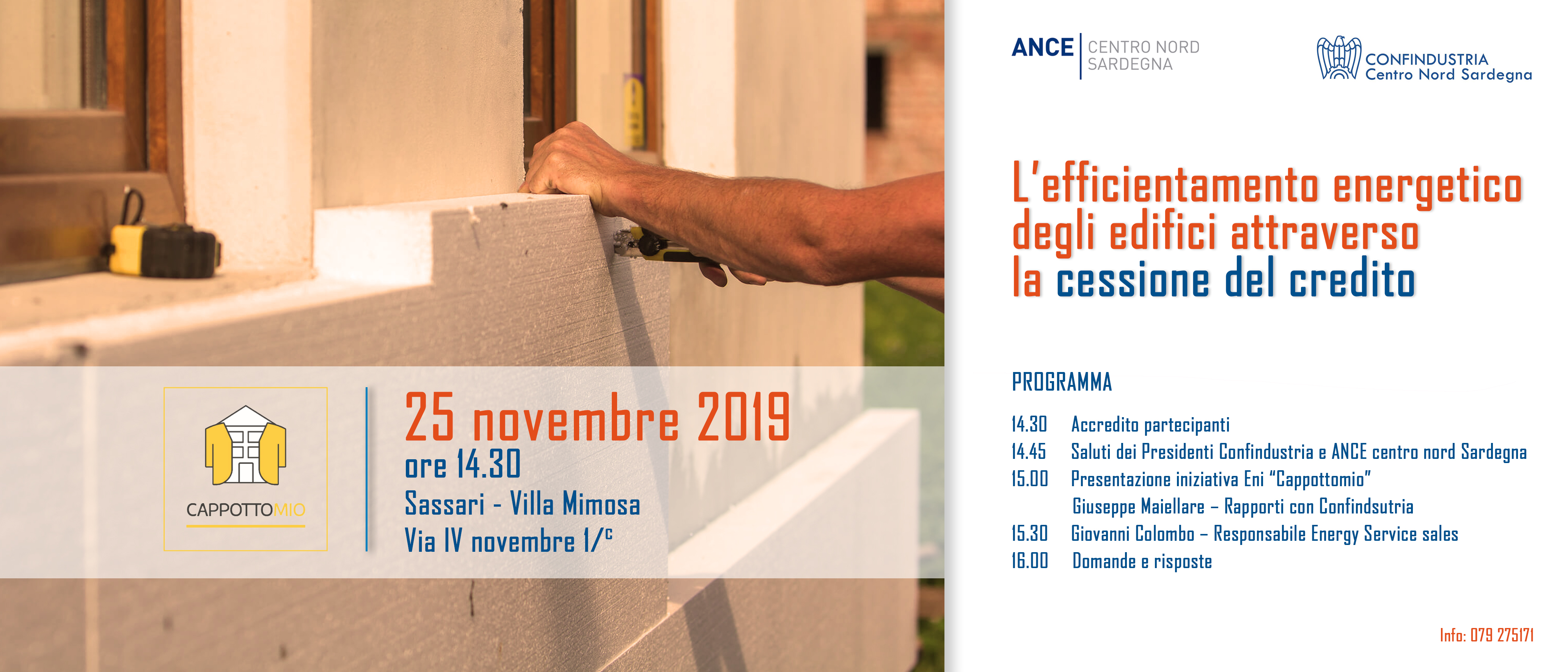 Si svolgerà lunedì 25 novembre, con inizio alle ore 14.30, presso la Sala specchi di villa Mimosa a Sassari, l’incontro con Eni sulla “cessione del credito di imposta” per gli interventi di efficientamento energetico degli edifici.