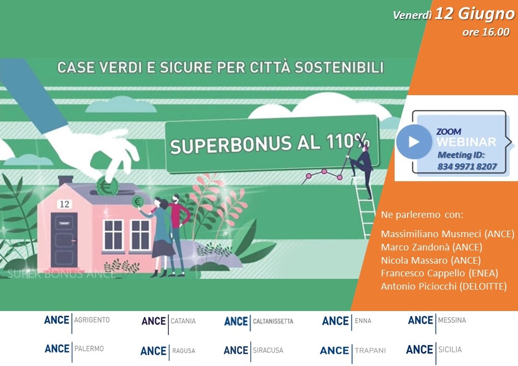 E’ in programma per venerdì 12 giugno alle ore 16.00 il webinar “Case verdi e sicure per città sostenibili. Superbonus al 110%” organizzato dalle nove territoriali Ance siciliane insieme ad Ance Sicilia con l’obiettivo di illustrare e spiegare tutte le novità della nuova misura.