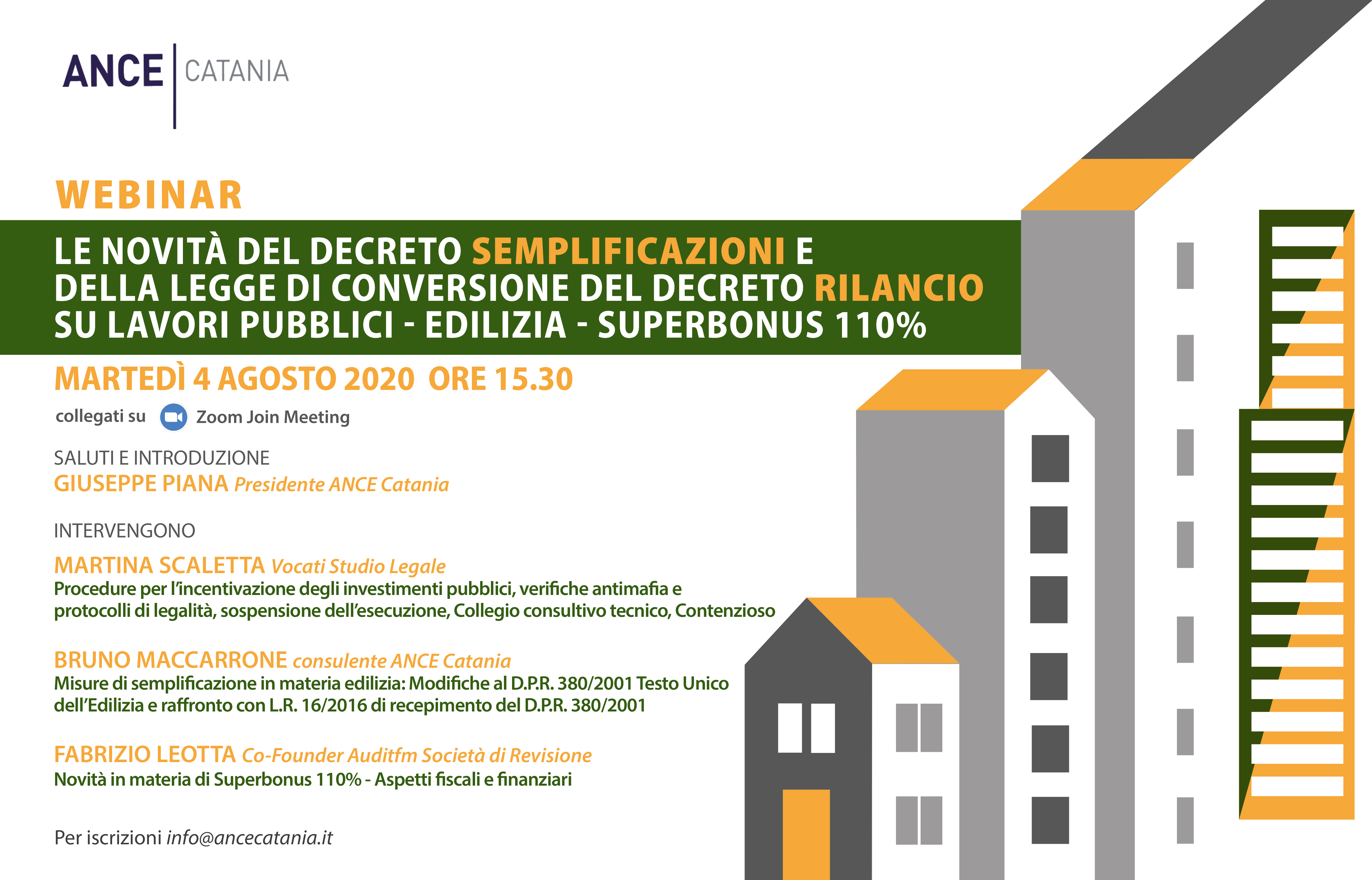 Si svolgerà martedì 4 agosto alle ore 15.30 in videoconferenza un webinar su "Le novità del decreto semplificazioni e della legge di conversione del dl Rilancio su lavori pubblici – edilizia – superbonus 110%" organizzato da Ance Catania