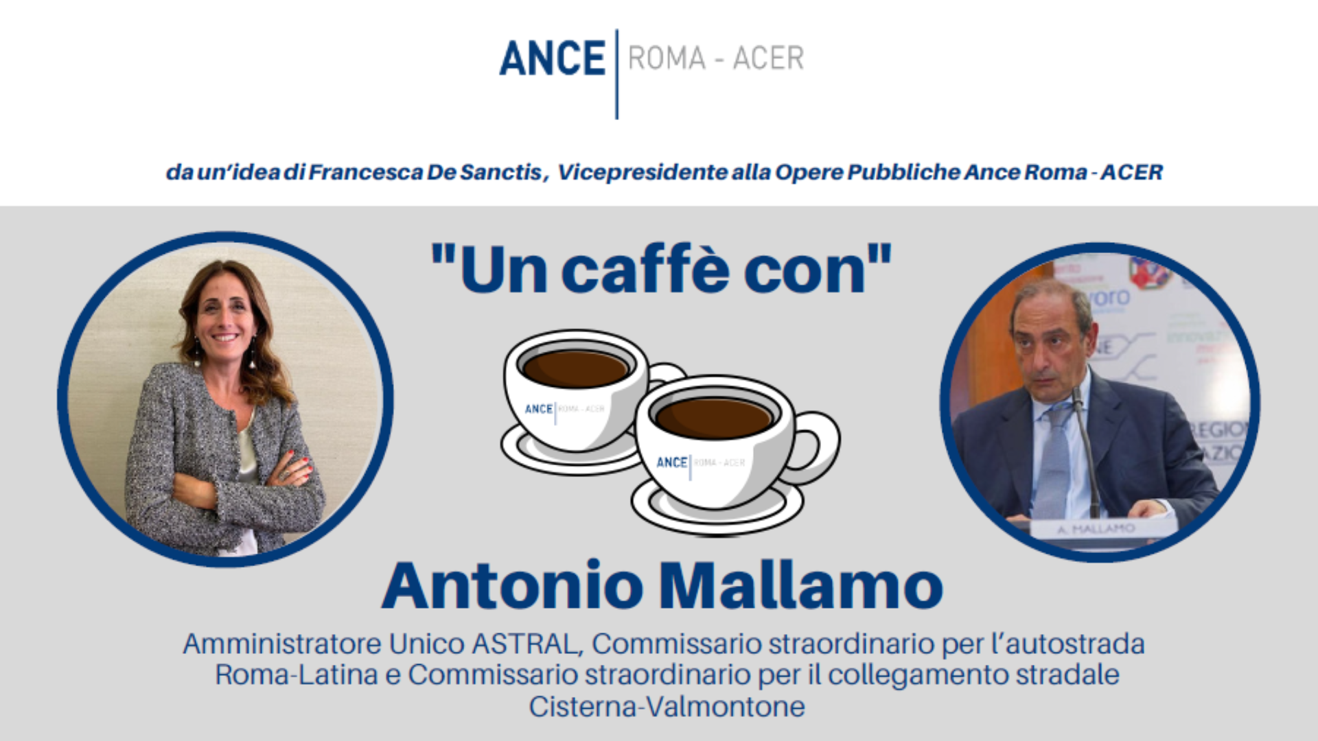 Tornano gli appuntamenti di “Un caffè con”, il format ideato dalla Vicepresidente alle Opere Pubbliche Ance Roma – Acer, Francesca De Sanctis, per approfondire tematiche legate al settore edile: mercoledì 22 maggio, alle ore 9.00, l’Associazione dei costruttori romani ospiterà Antonio Mallamo, Amministratore Unico Astral e Commissario straordinario per l’autostrada Roma – Latina e per il collegamento stradale Cisterna – Valmontone, a Roma.